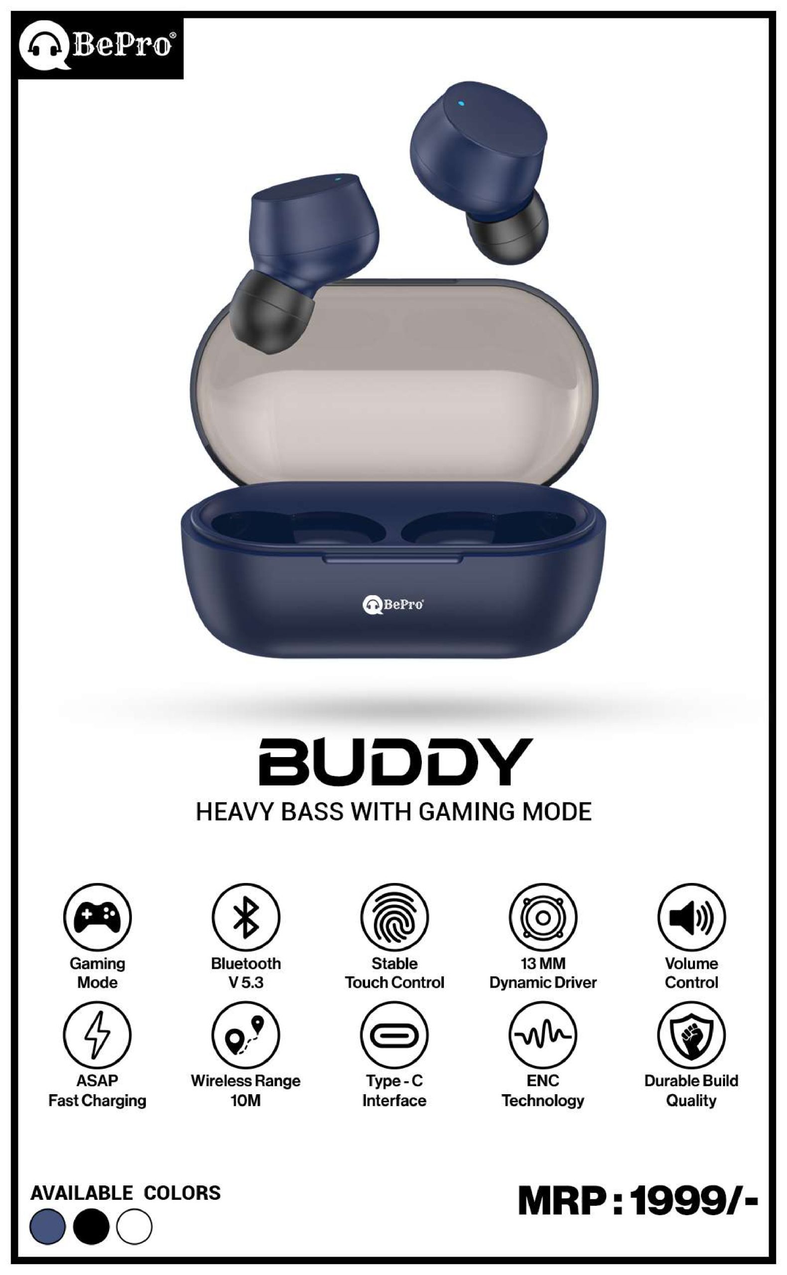 Introducing the BUDDY BePro Earbuds , designed to provide an immersive music and gaming experience,with 10 MM Dynamic Boost Drivers to deliver powerful and dynamic sound to enhance your listening experience & low latency of 88ms for smooth and lag-free audio while gaming or watching videos.Equipped with The Environmental Cancellation (ENC) feature helps in reducing background during calls, ensuring clearer and better call quality, Bluetooth version 5.4 ensures stable and reliable connectivity with your devices. The IPX5 rating makes the BUDDY BePro Earbuds resistant to water and sweat, making them suitable for workouts and outdoor activities. Super Fast 10 Min Charge for 120 Min Play Time: With just a 10-minute charge, you can enjoy up to 120 minutes of playback time, ensuring you have music whenever you need it. Together all these features make the BUDDY BePro Earbuds a great choice for those looking for a versatile and high-performance pair of earbuds for both music and gaming