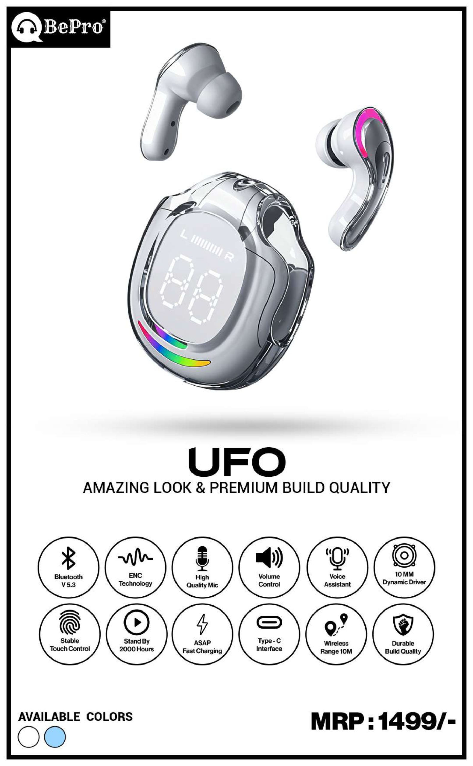 Introducing the UFO TWS BePro Earbuds , designed to provide an immersive music and gaming experience,with 10 MM Dynamic Boost Drivers to deliver powerful and dynamic sound to enhance your listening experience & low latency of 88ms for smooth and lag-free audio while gaming or watching videos.Equipped with The Environmental Cancellation (ENC) feature helps in reducing background during calls, ensuring clearer and better call quality, Bluetooth version 5.4 ensures stable and reliable connectivity with your devices. The IPX5 rating makes the UFO TWS BePro Earbuds resistant to water and sweat, making them suitable for workouts and outdoor activities. Super Fast 10 Min Charge for 120 Min Play Time: With just a 10-minute charge, you can enjoy up to 120 minutes of playback time, ensuring you have music whenever you need it. Together all these features make the UFO TWS BePro Earbuds a great choice for those looking for a versatile and high-performance pair of earbuds for both music and gaming